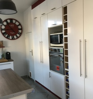 Agrandir la cuisine visuellement car l’espace est petit, et créer de nombreux rangements.